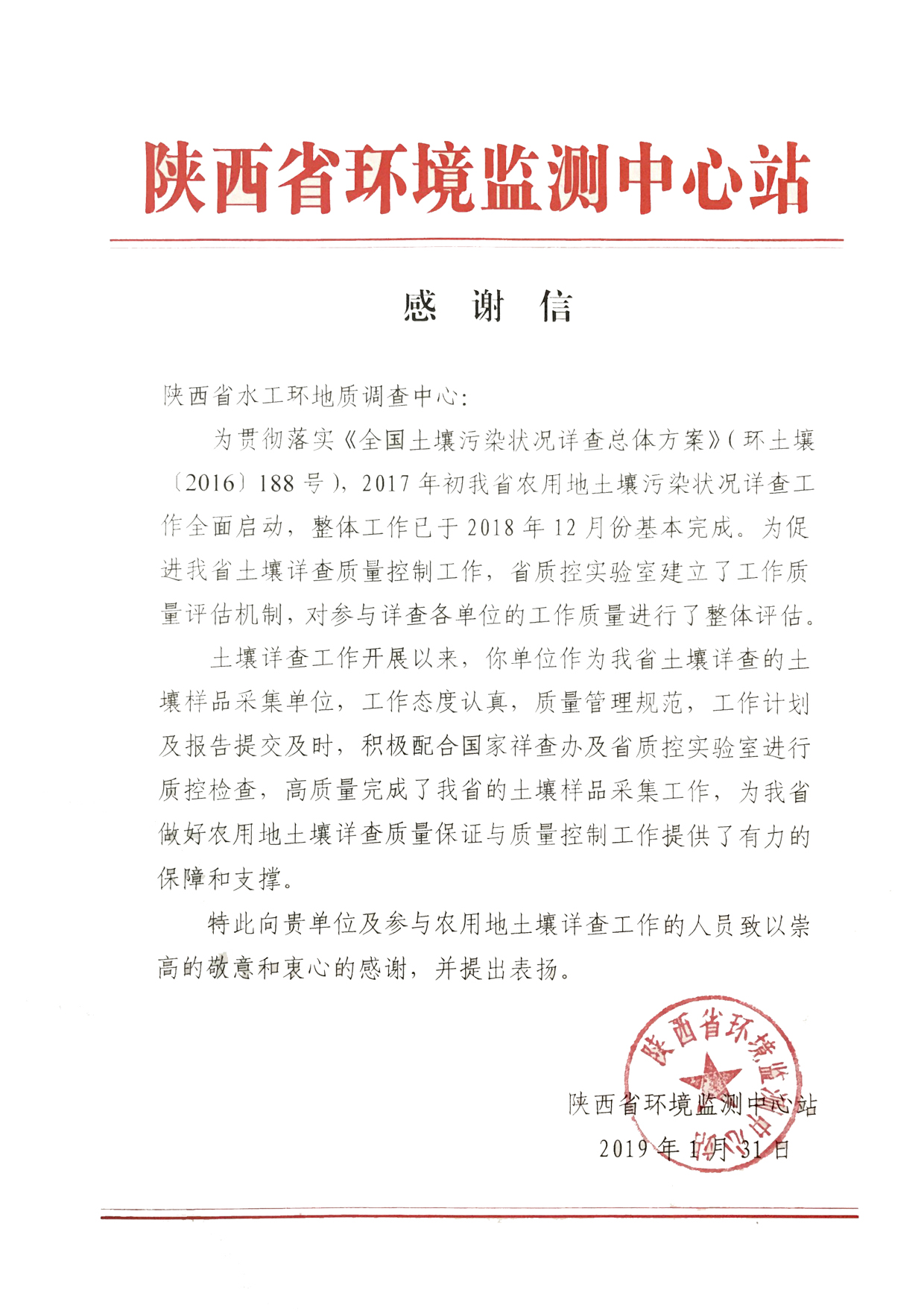 2019年1月31日陜西省環(huán)境監(jiān)測中心站(省土壤詳查質控實驗室)下發(fā)了對我中心的感謝及表揚信,高度認可了我中心在“陜西省農用地土壤樣品采集”質量保證與質量控制工作中做出的貢獻,認為我中心工作態(tài)度認真、質量管理規(guī)范、工作計劃及報告提交及時、積極配合國家詳查辦及省質控實驗室的質量檢查工作,高質量地完成了我省農用地土壤樣品采集工作,為我省農用地土壤污染狀況詳查質量保證與質量控制提供了有力的保障和支持。