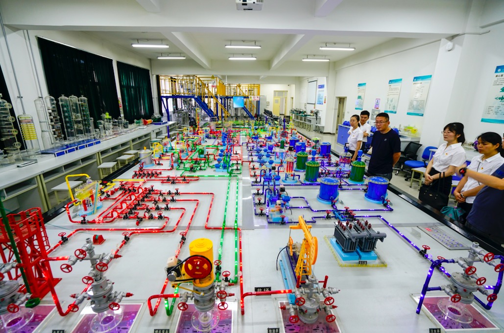 2021年7月8日下午,中共陜西省水工環地質調查中心第二、八黨支部和地熱所部分同志赴西安石油大學工程訓練中心(陜西省石油石化虛擬仿真實驗教學中心)觀摩學習。黨員同志們在學校趙老師的悉心講解下,先后參觀了地質實訓室、鉆井實訓室、采油實訓室、油氣集輸實訓室,并同講解老師進行專業方面的友好交流。在地質實訓室,同志們仔細觀看巖礦和化石標本,了解油氣儲層和油氣藏靜態地質特征與油氣田開發動態響應的內在聯系。在鉆井實訓室,同志們先是通過模型鉆機了解鉆井的設備和功能,隨后通過司鉆模擬器,觀摩完整的起下鉆過程,對于鉆井的作業有了直觀的認識。觀看教學動畫,學習了鉆機頂驅等新設備。在采油實訓室,學習游梁式、鏈條式、離心式、螺桿式抽油機的原理。在油氣集輸實訓室,同志們通過集輸流程沙盤,詳細了解油氣集輸的全部流程,特別是原油的伴熱集輸流程,該流程主要是通過換熱器將集輸管線中的原油進行加熱,降低原油粘度,保障原油冬季集輸順利。